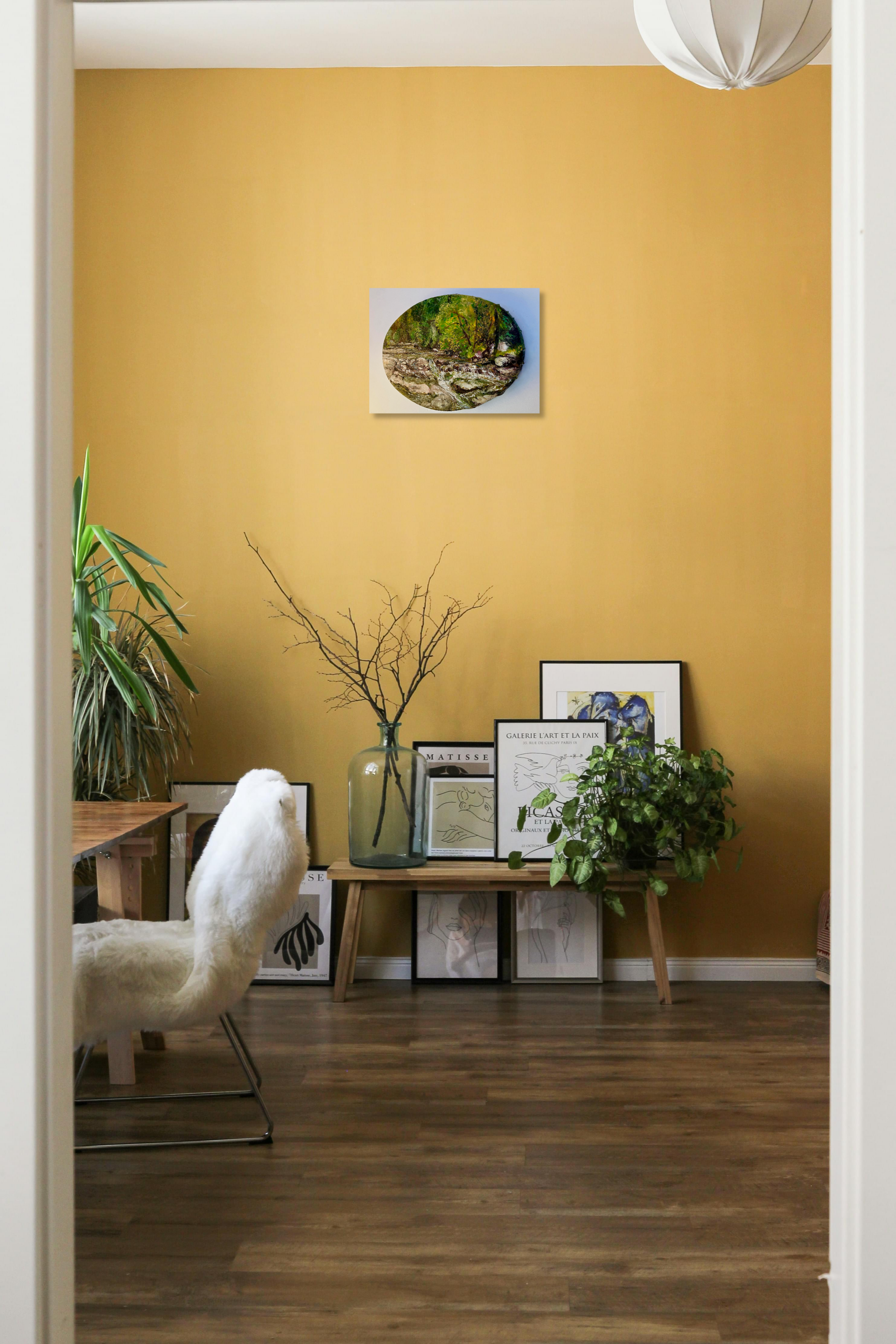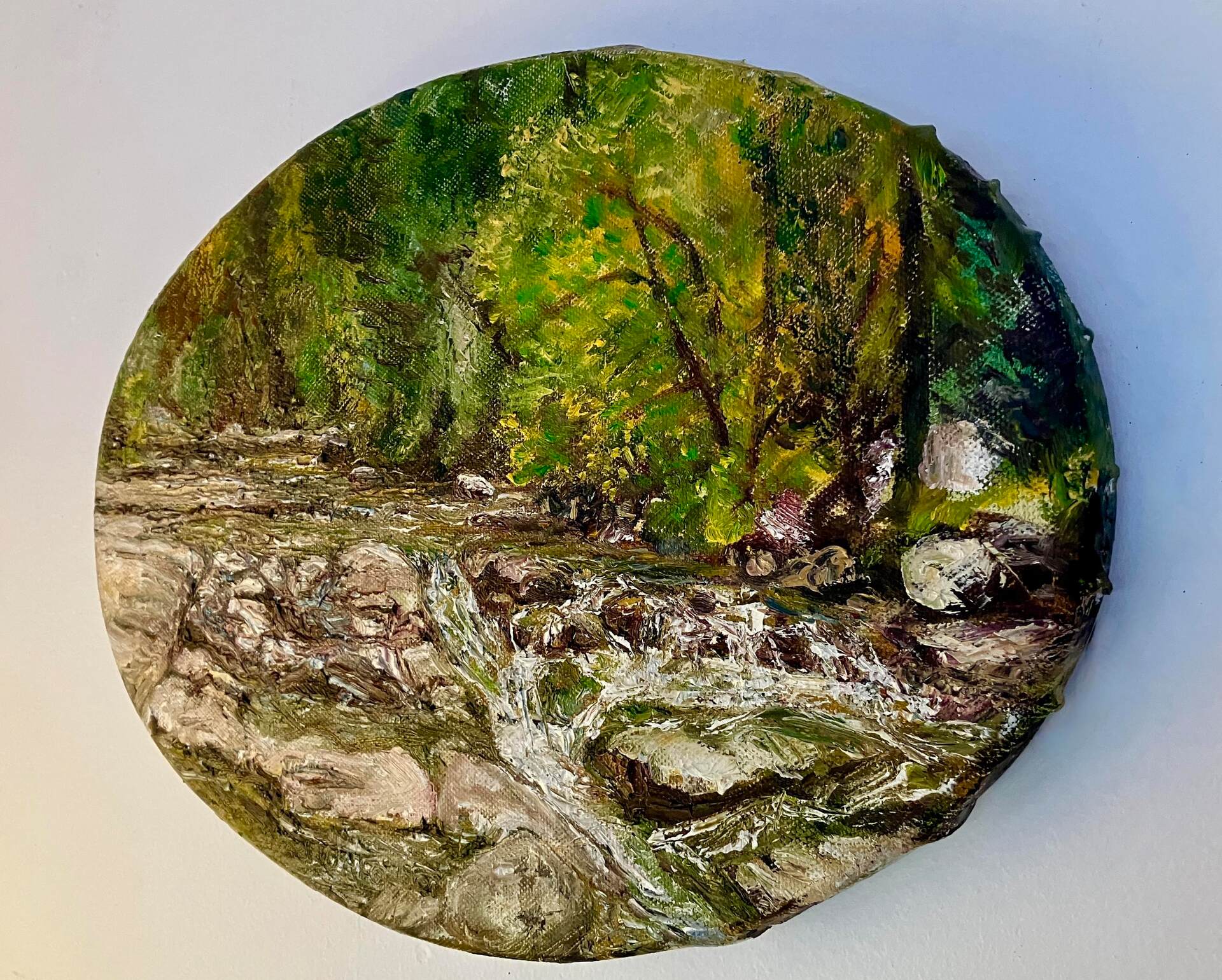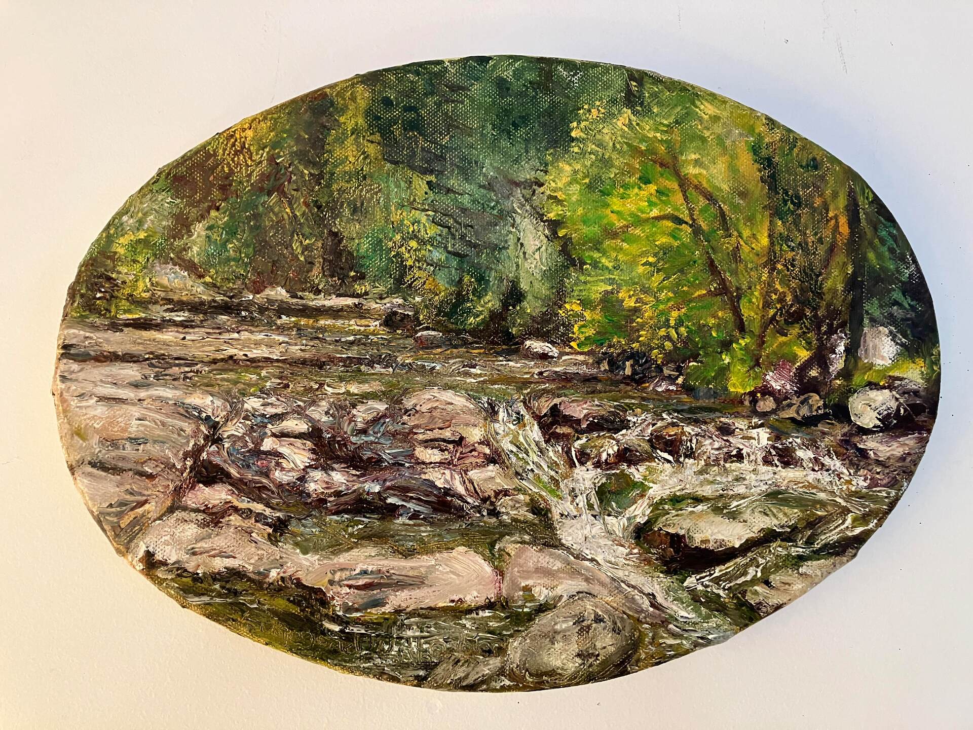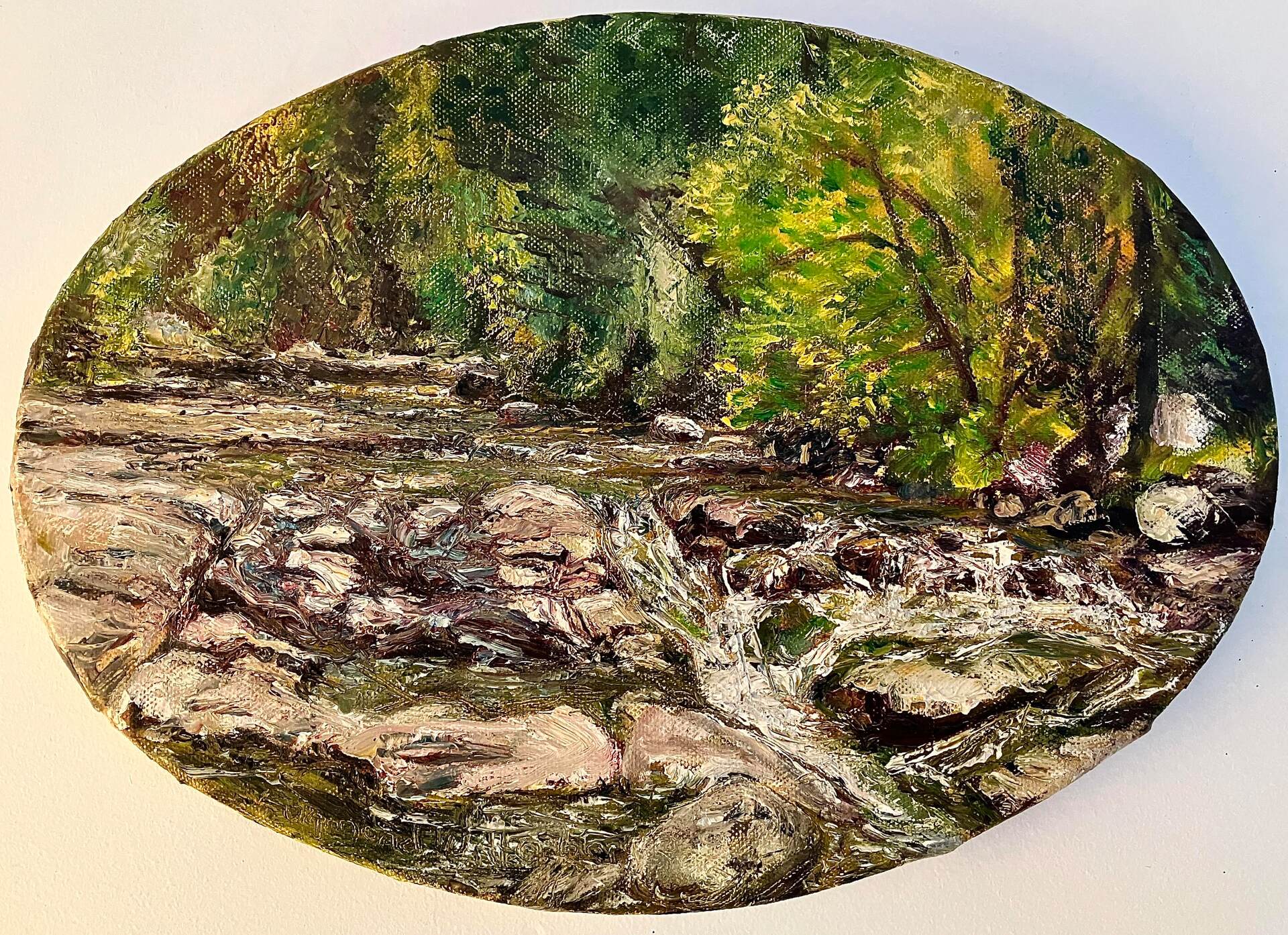 Painted Pleine Air in the deepest length of the Lachlan Valley west of New Norfolk where the rivulets has defended and still flows with the momentum it gained tumbling down off the high slopes. Peviously owned by the artist's mother.
